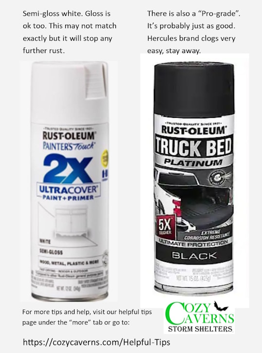 For touching up what shows on the outside, use Rust-Olem Truck bed liner. We've tested a few, and that was the best. We use a two-part marine epoxy, but it's $300 for one kit. You don't need that much. If your floor is really bad, we recommend Dura-Plate 235 from Sherwin Williams. It's a two-part epoxy and about $100 for the two-part kit, but it's a thick rubber-like coating. One gallon should do most size shelters. Tell Sherwin Williams it's for Cozy Caverns and get our discount. Wear a good respirator, gloves, and protective clothing with these paints. Get fresh air often and use your noodles.